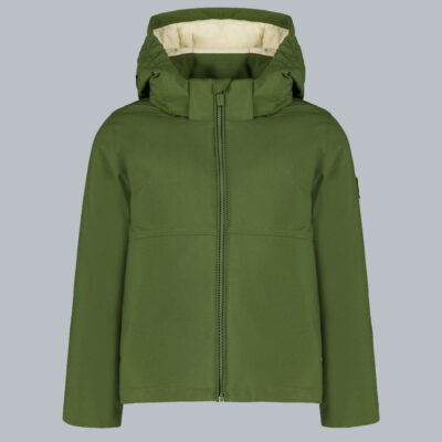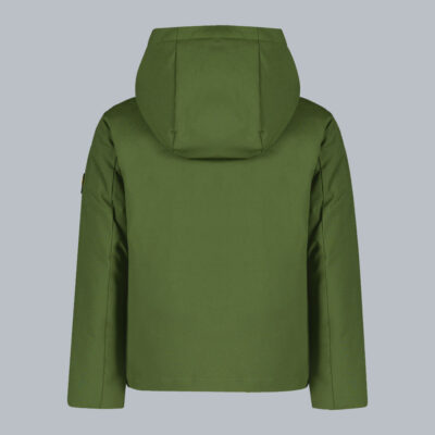 Giacca verde militare da bambino con cappuccio realizzata in tessuto softshell mechanical stretch 2 layers con imbottitura ecologica e zip a contrasto.