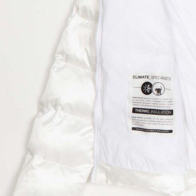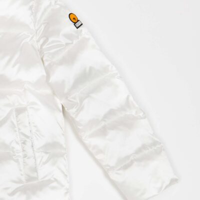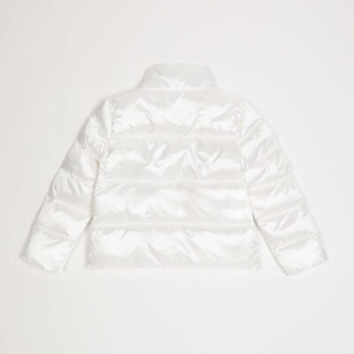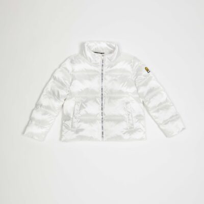 DEA GIRL – Piumino corto full zip bianco in tessuto nylon effetto metallico caratterizzato da grandi maxi filze, ed imbottitura ecologica.