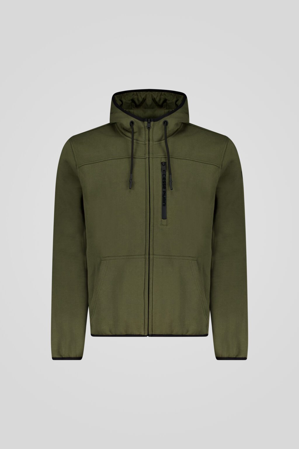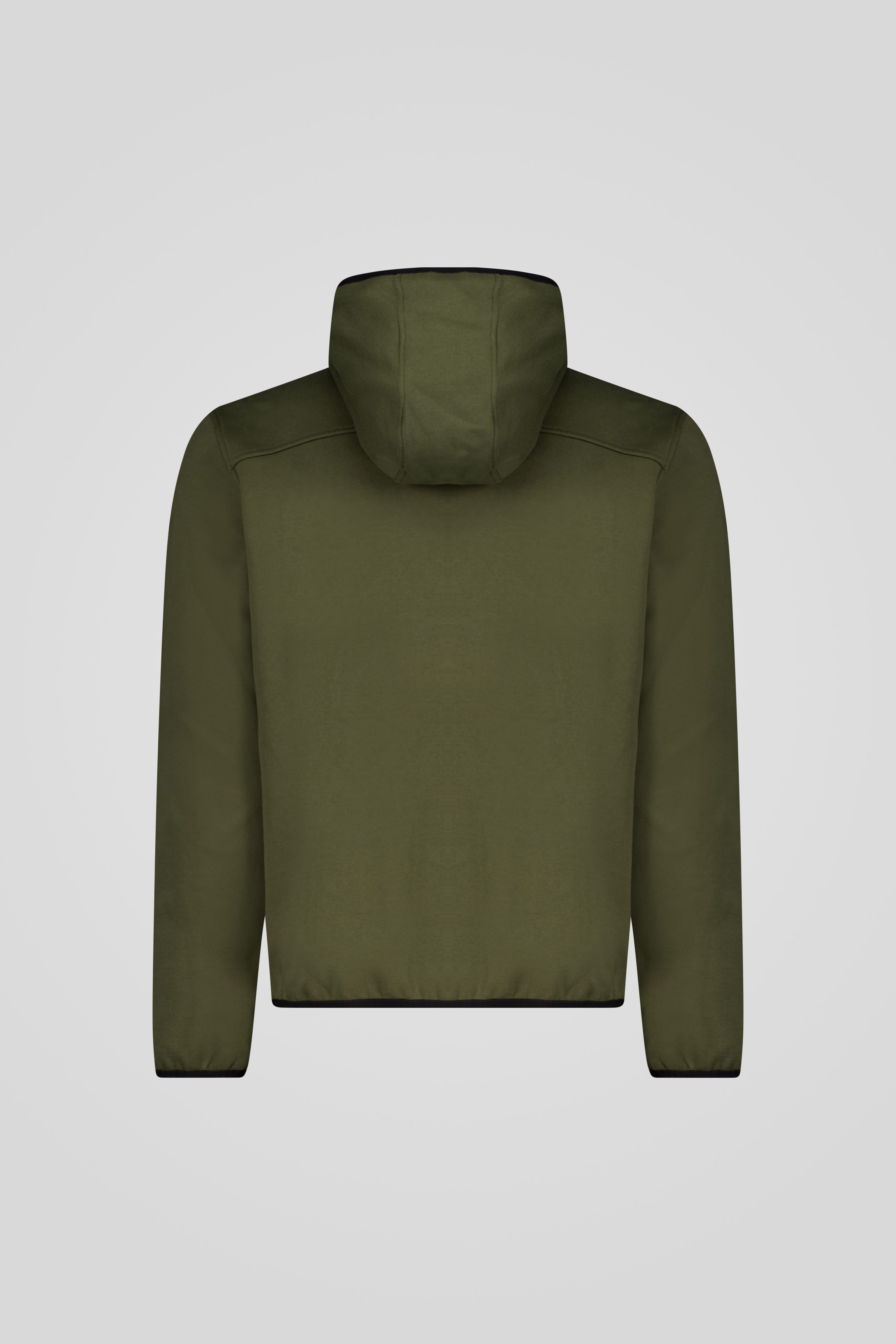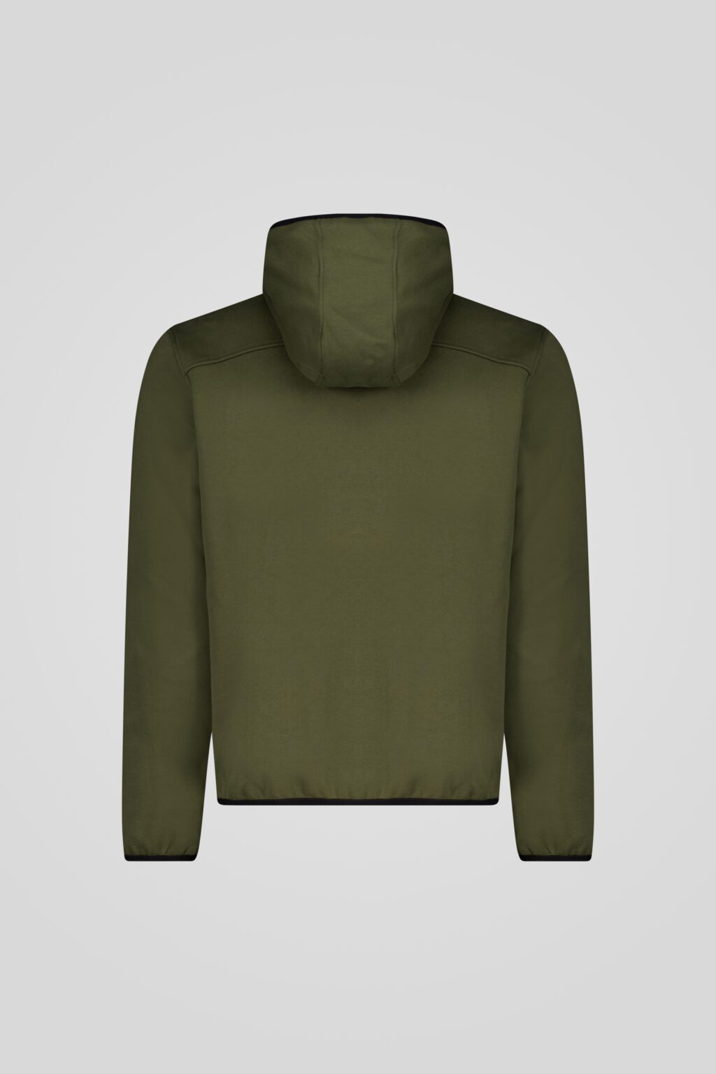 Felpa verde militare in polycotton con cappuccio foderato e tasche a marsupio.