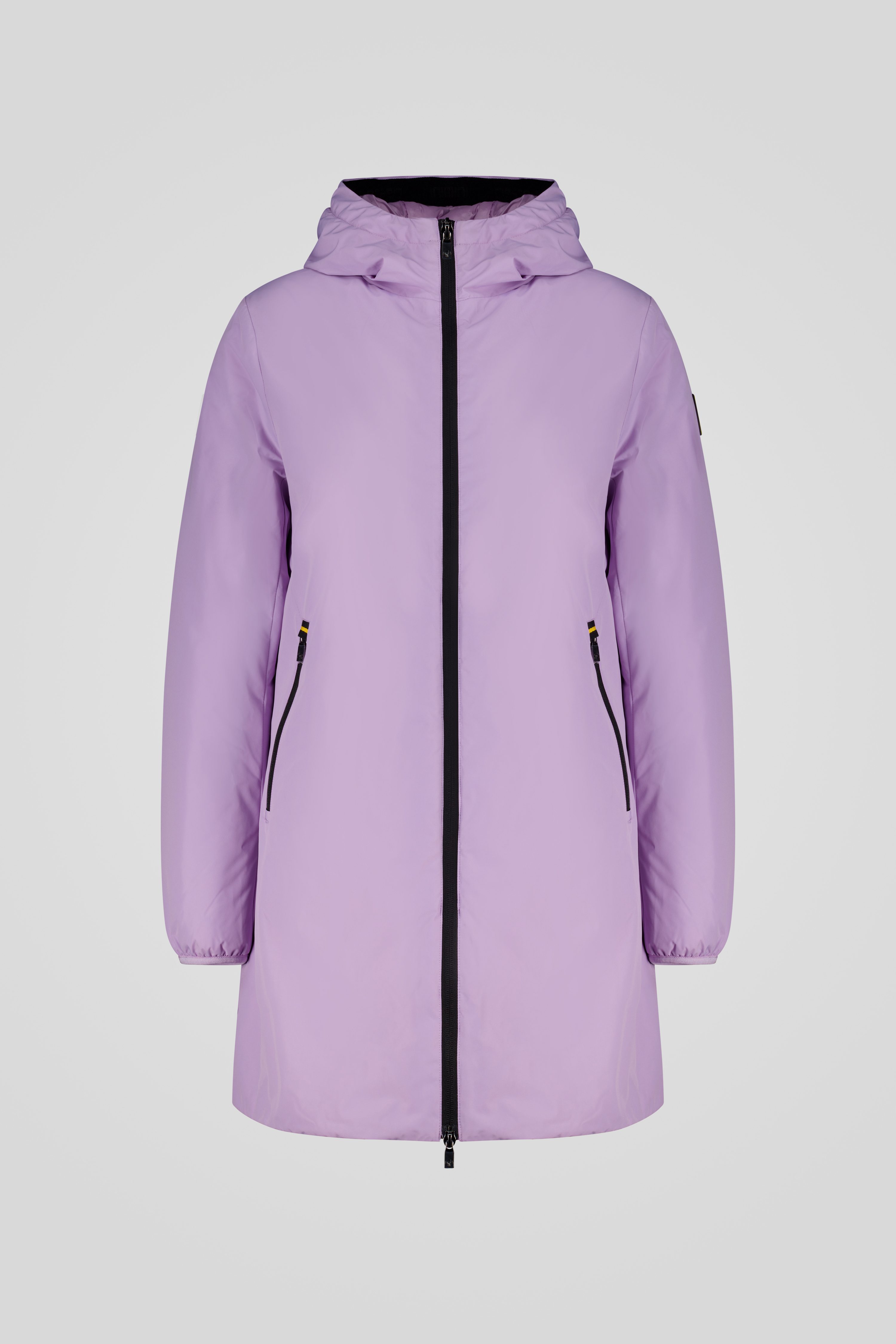 Giacca lunga imbottita lilla con cappuccio