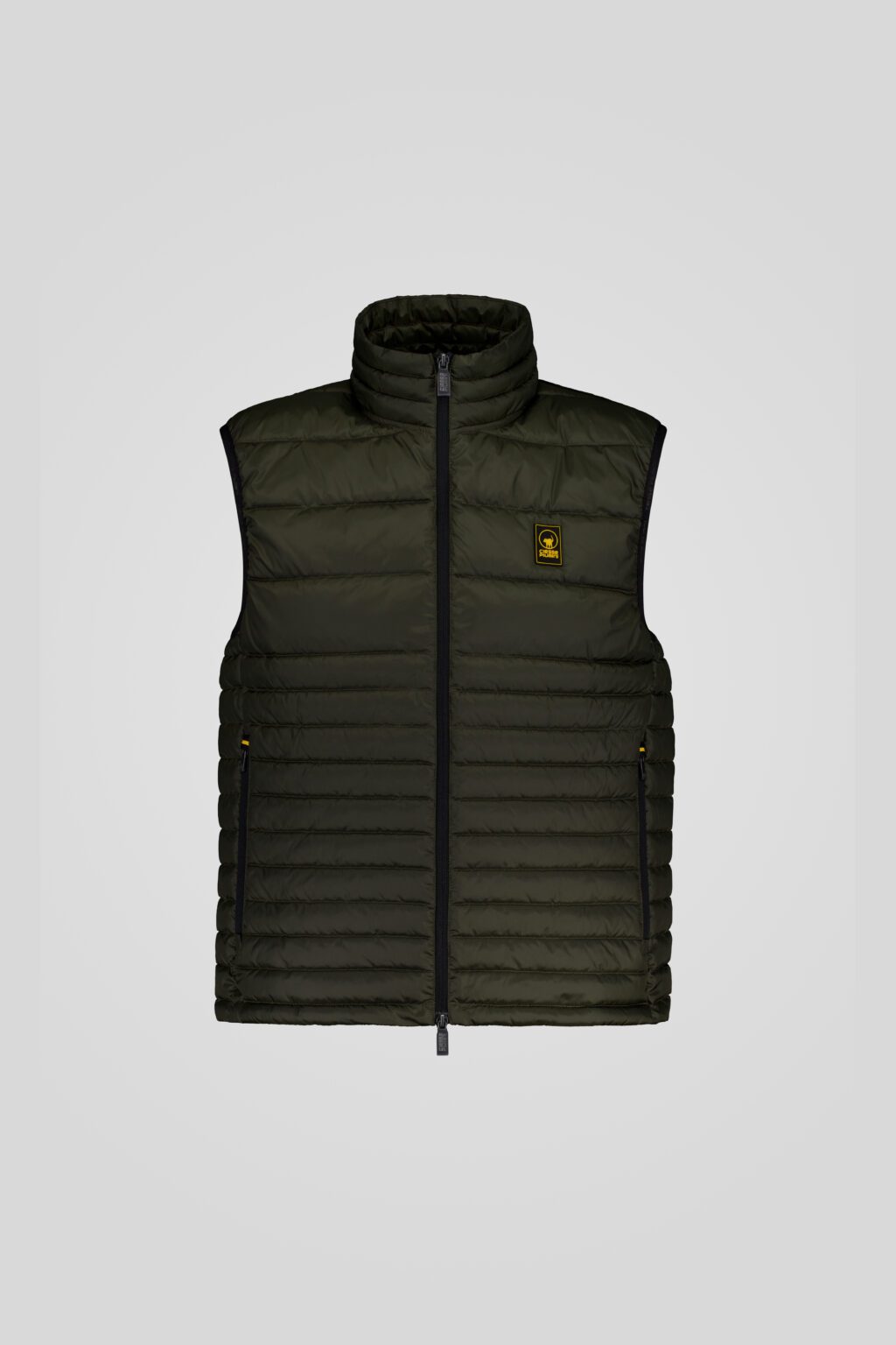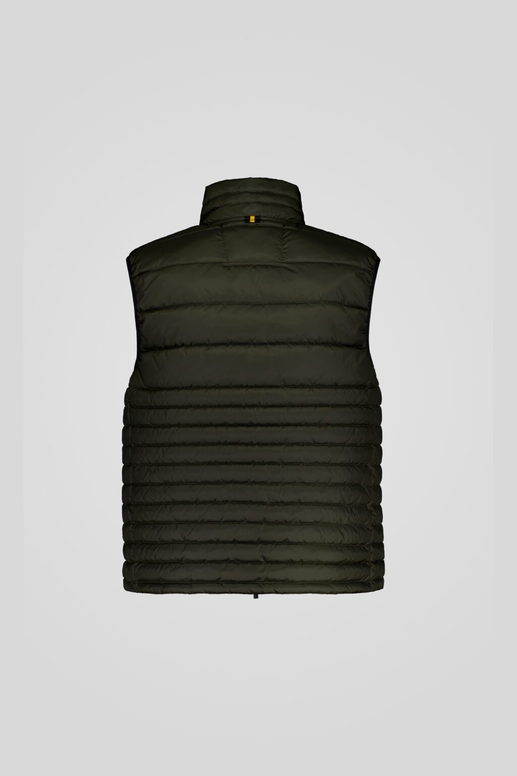 Gilet verde militare trapuntato realizzato in tessuto micro ripstop riciclato, leggero e attento all’ambiente.