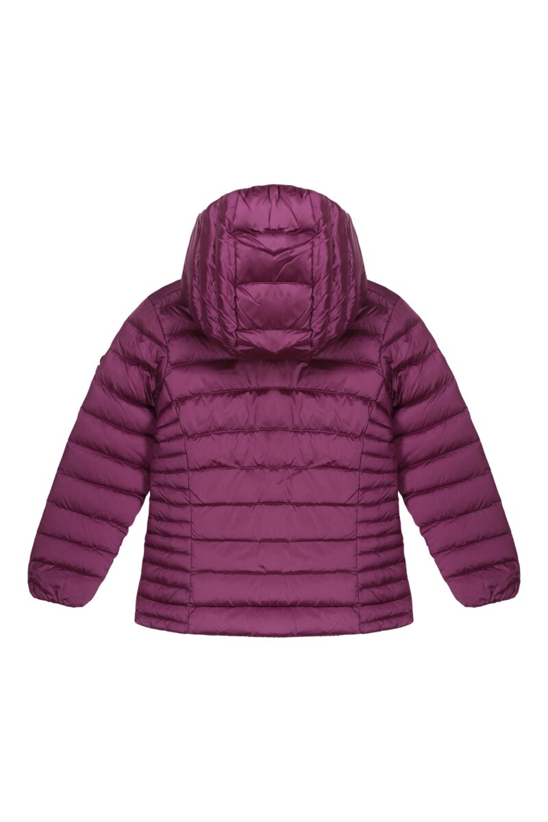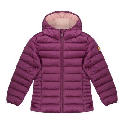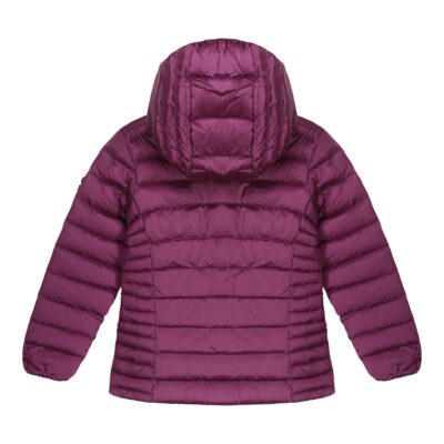 KARIS GIRL – Piumino viola con cappuccio da bambina realizzato in tessuto nylon cal dall’effetto lucido ed imbottito in vera piuma certificata 800 fill power