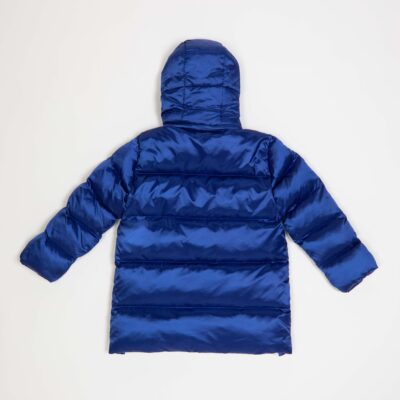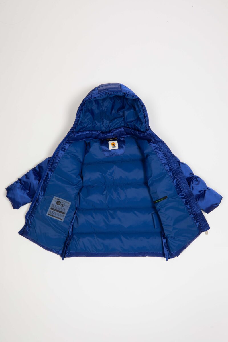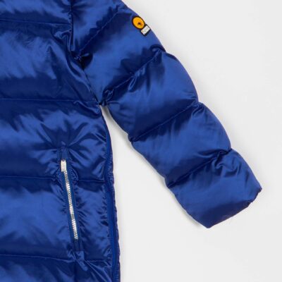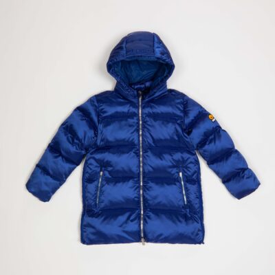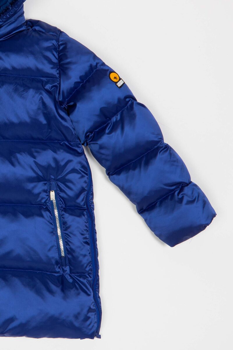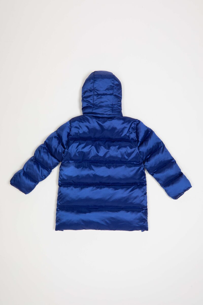 NINFA GIRL – Piumino lungo blu elettrico in tessuto nylon effetto metallico caratterizzato da grandi maxi filze, cappuccio removibile ed imbottitura ecologica.