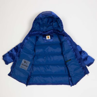 NINFA GIRL – Piumino lungo blu elettrico in tessuto nylon effetto metallico caratterizzato da grandi maxi filze, cappuccio removibile ed imbottitura ecologica. Questo capo si contraddistingue per la sua linea svasata, che puo’ essere maggiormente ampliata aprendo le due lunghe zip laterali sul findo. Il tessuto nylon lucente e molto piacevole al tatto, le zip metalliche ed il volume moderno contribuiscono a valorizzare il capo, adatto alle più attente allo stile già da piccole.