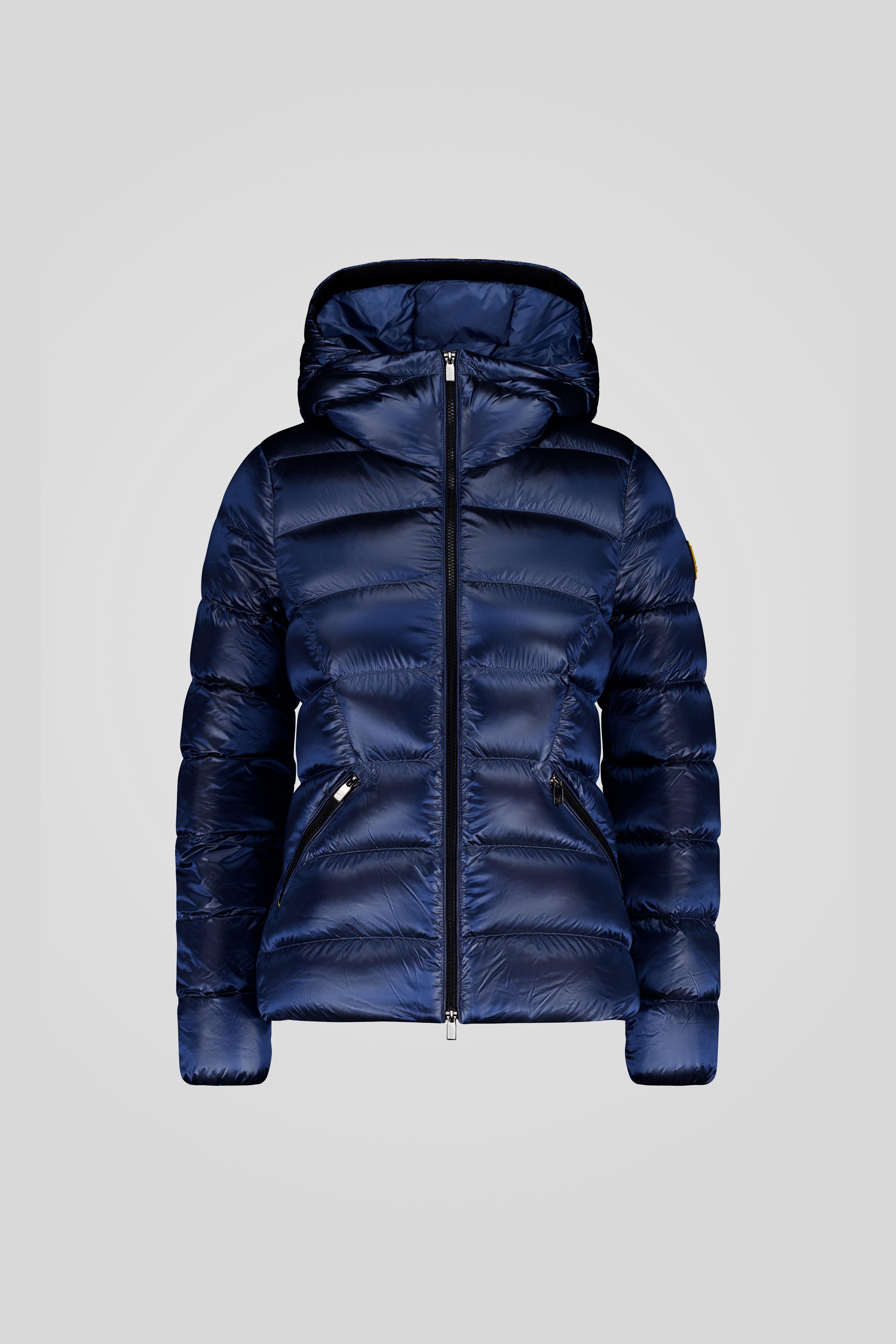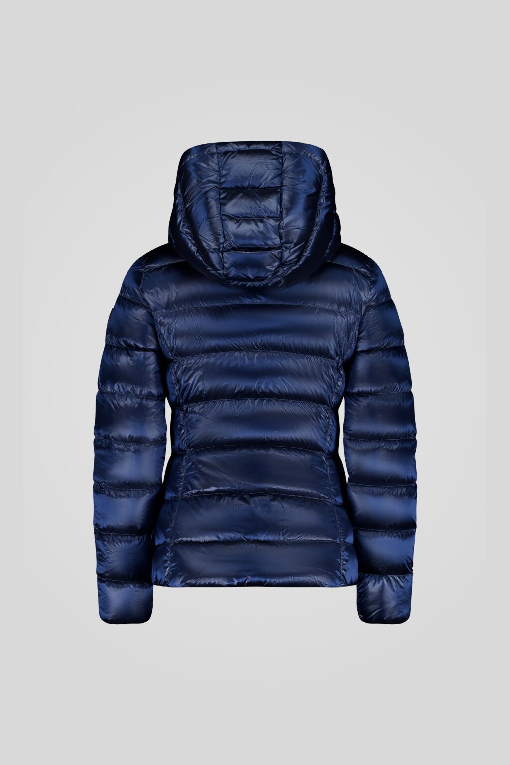 Piumino azzurro 200 grammi con cappuccio fisso, realizzato in tessuto microripstop lucido a trama nera e imbottito con vera piuma certificata 800 fill power,sinonimo di massima leggerezza e alto isolamento termico.