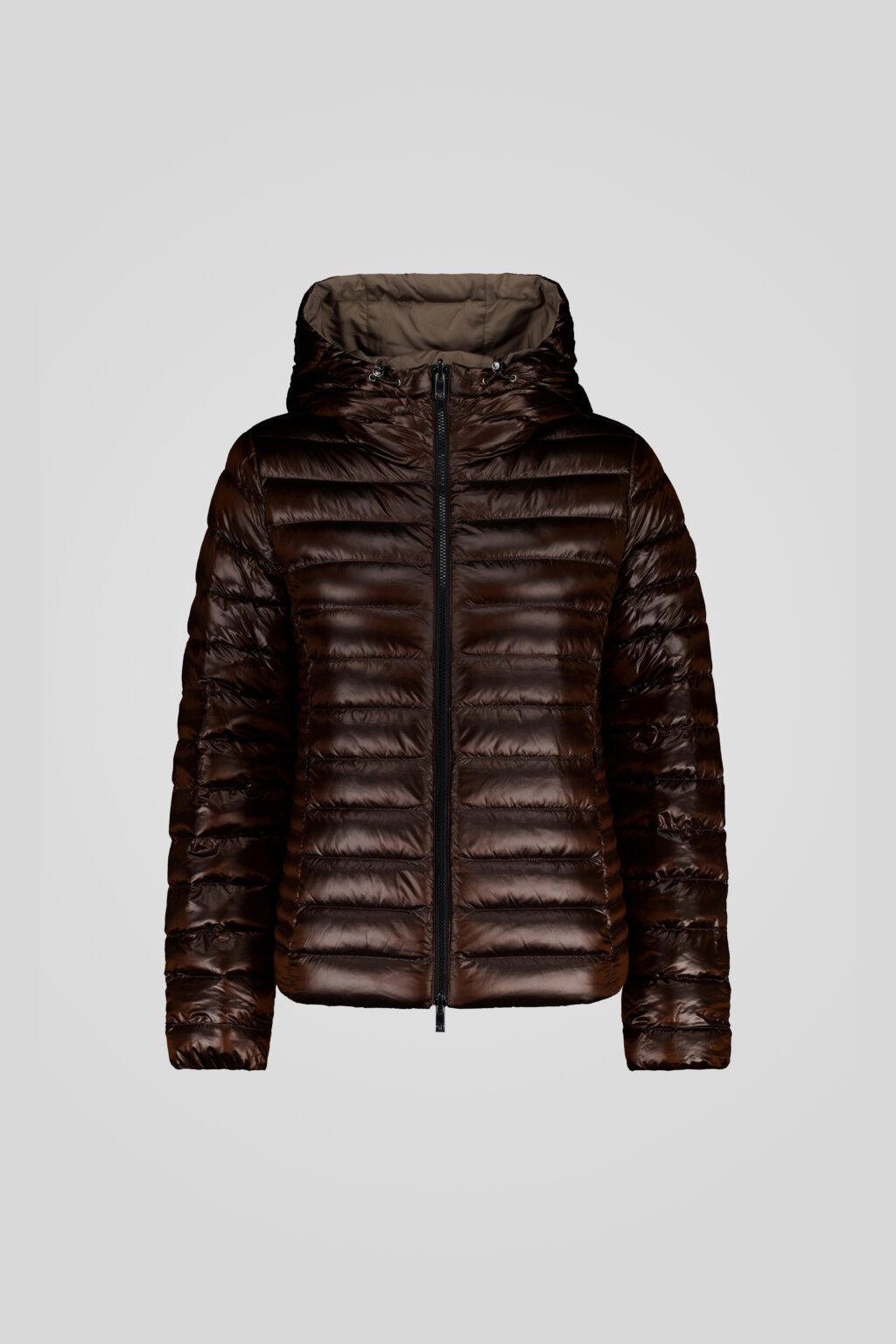 Piumino corto marrone reversibile, che offre due opzioni di utilizzo grazie ai due lati: uno in tessuto taffetas liscio, elegante e raffinato, e l’altro in nylon trapuntato con effetto lucido.