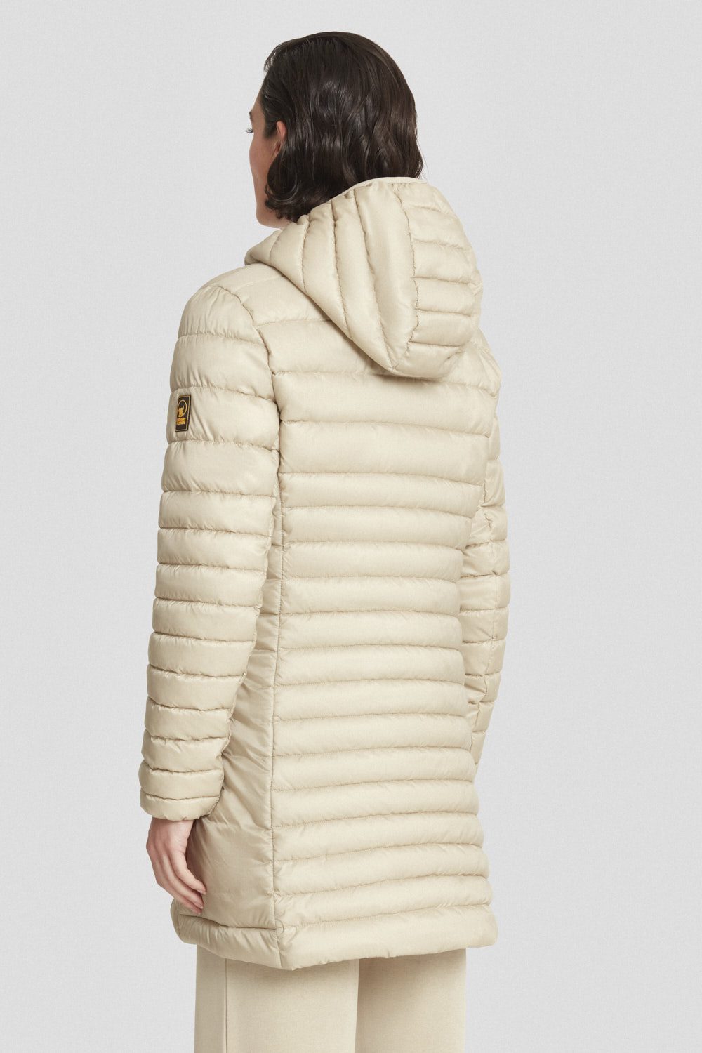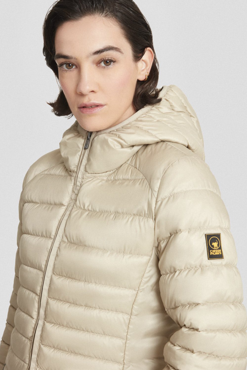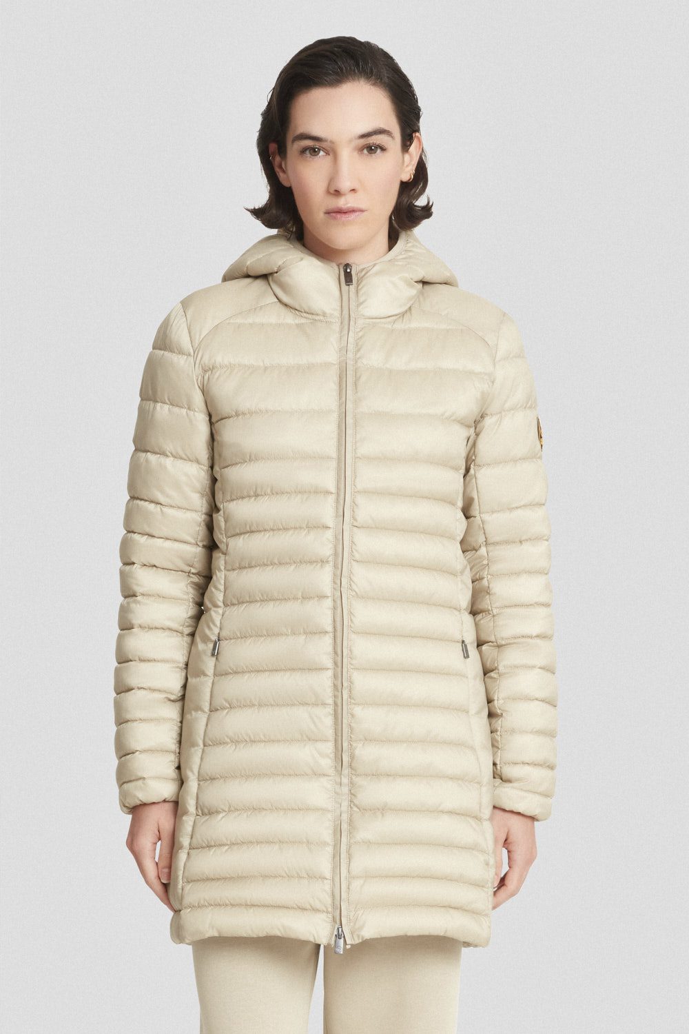 Piumino lungo beige trapuntato con cappuccio, realizzato in tessuto nylon cirè riciclato e imbottito con materiale riciclato.