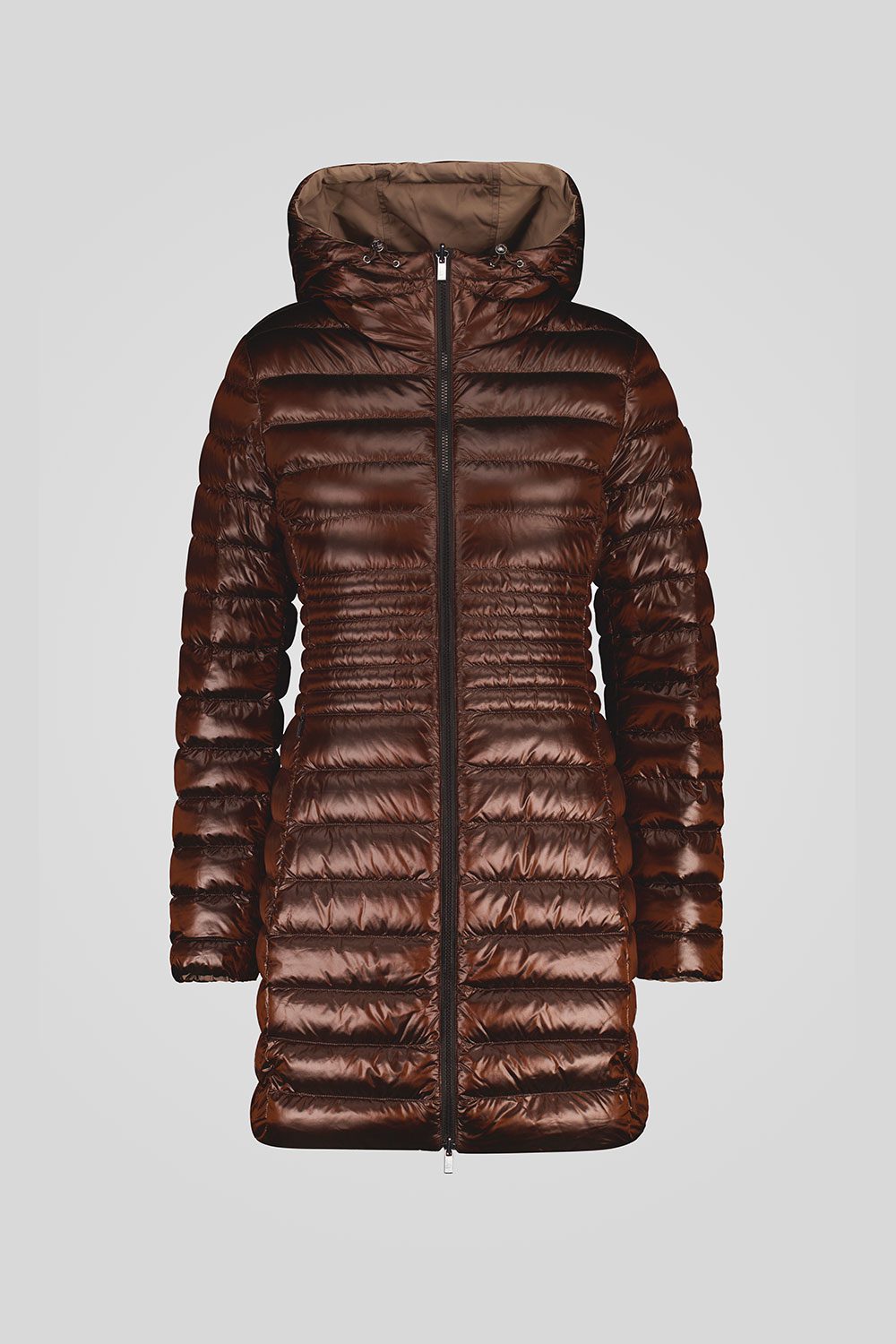 Piumino lungo marrone reversibile che offre due diverse opzioni di utilizzo grazie al doppio lato: uno in tessuto taffetas liscio, elegante e curato, e l’altro in nylon trapuntato con effetto lucido.