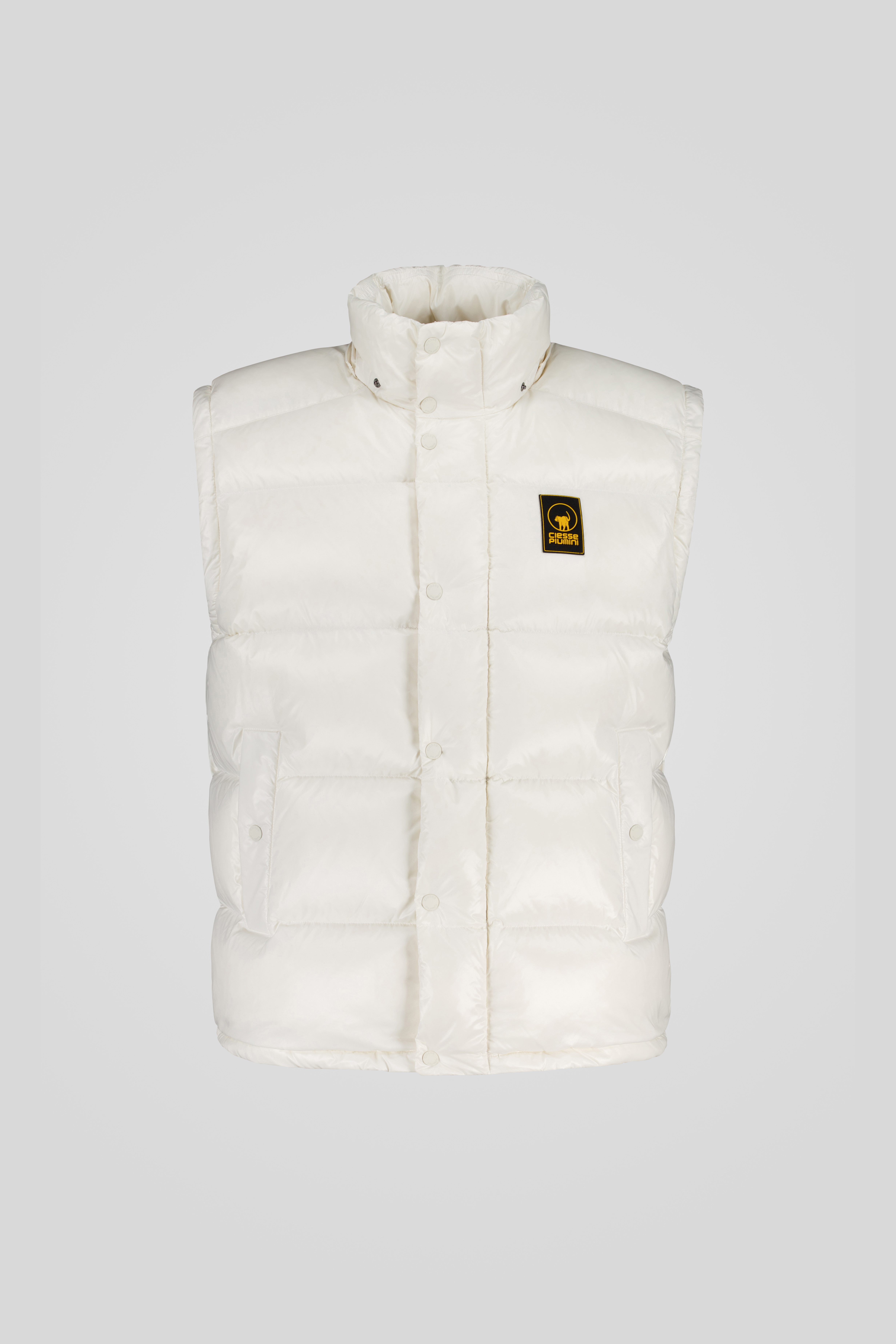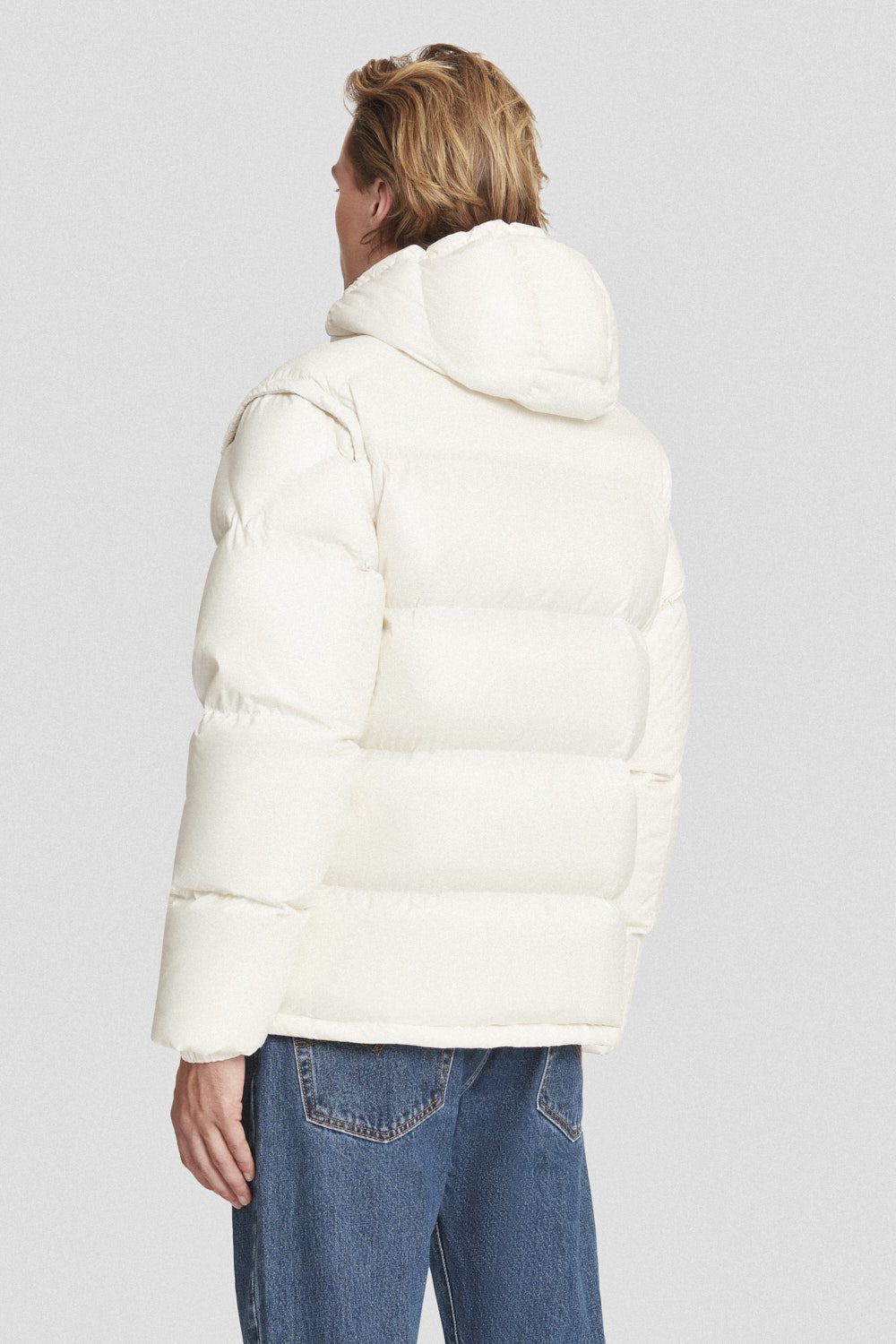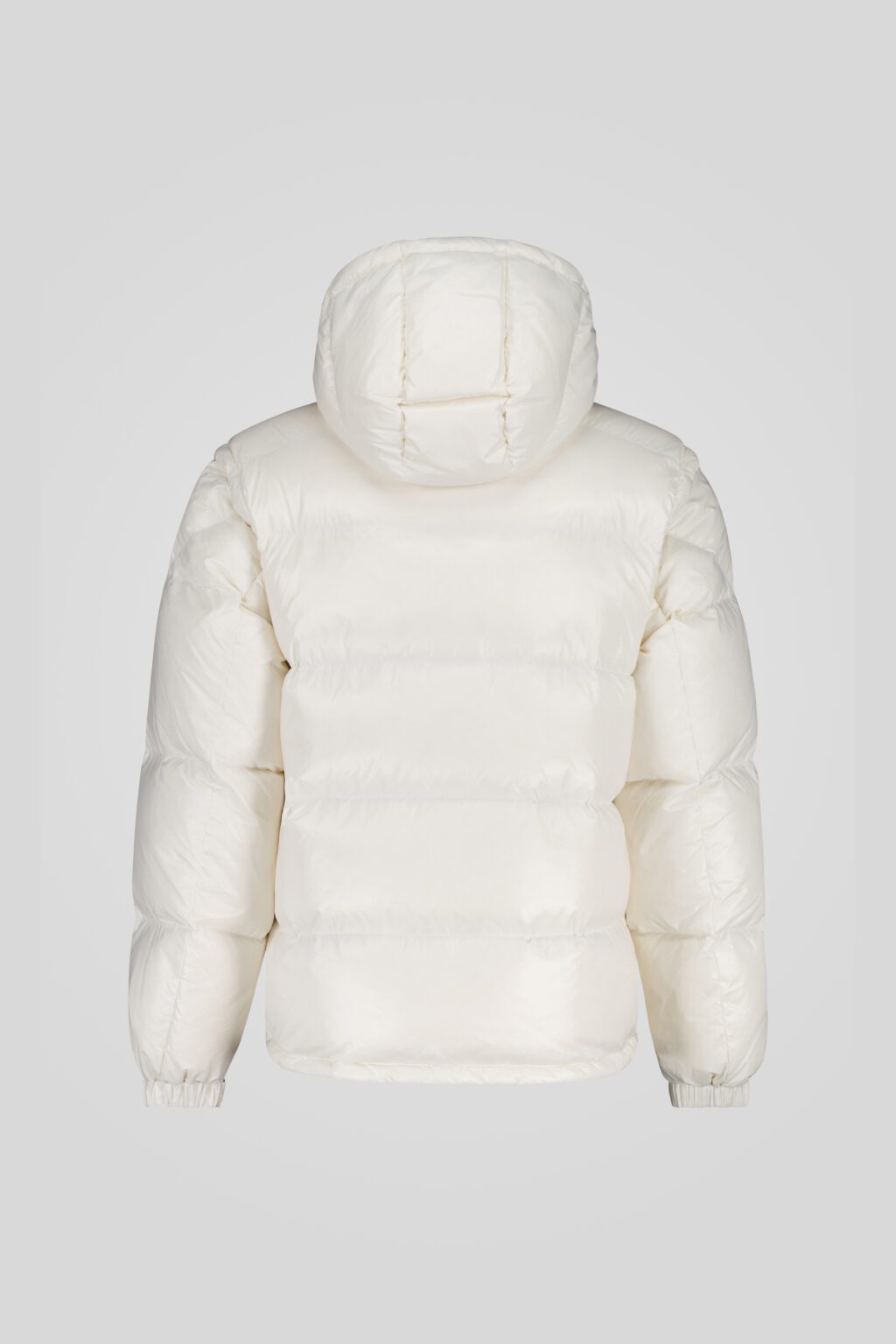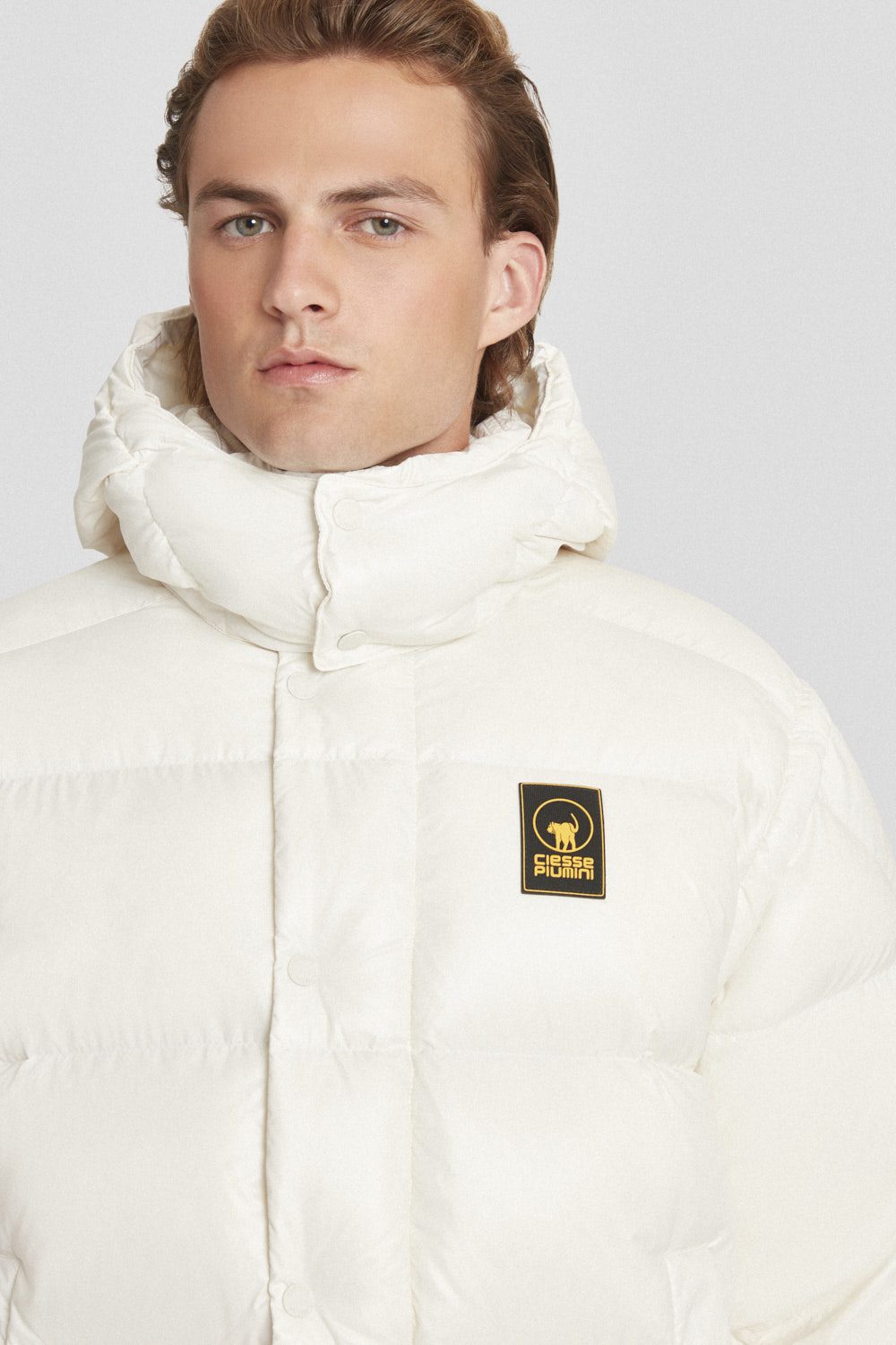Piumino trapuntato bianco dallo stile versatile e contemporaneo, imbottito in vera piuma d’oca e realizzato in tessuto Lacqué 100% nylon, lucido e resistente.