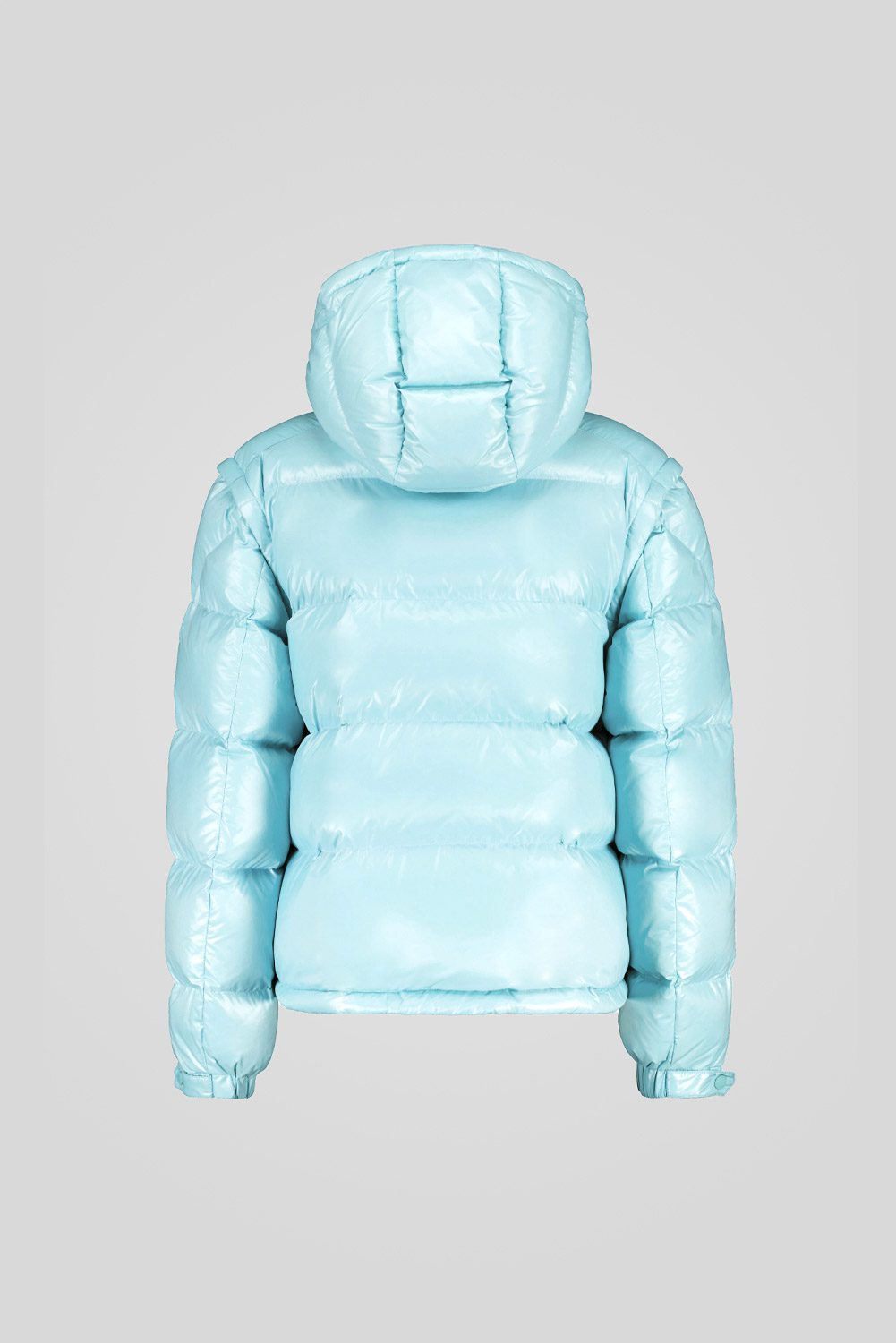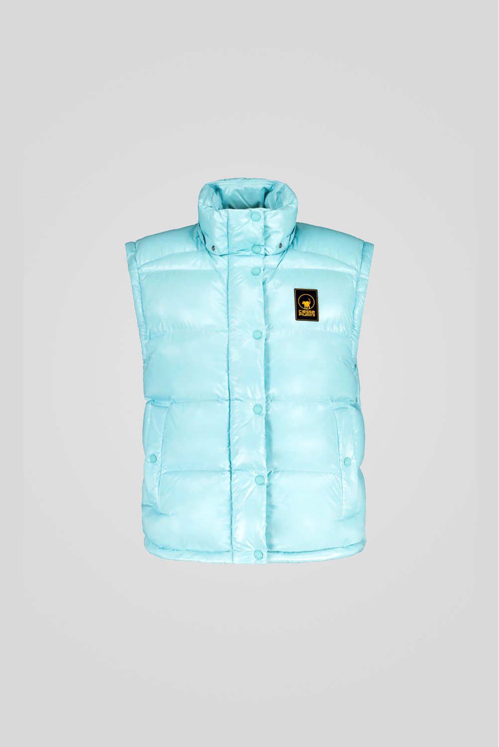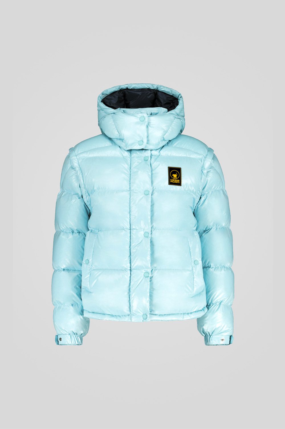 Piumino trapuntato azzurro da donna, dallo stile versatile e contemporaneo, imbottito in vera piuma 90/10 e realizzato in tessuto Lacqué 100% nylon, lucido e resistente.