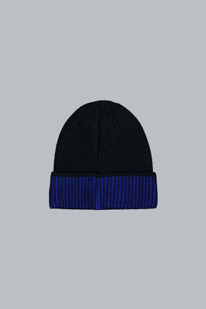 Cappello in maglia a coste in colore blu da uomo con risvolto realizzato in trama vanisè a due colori.