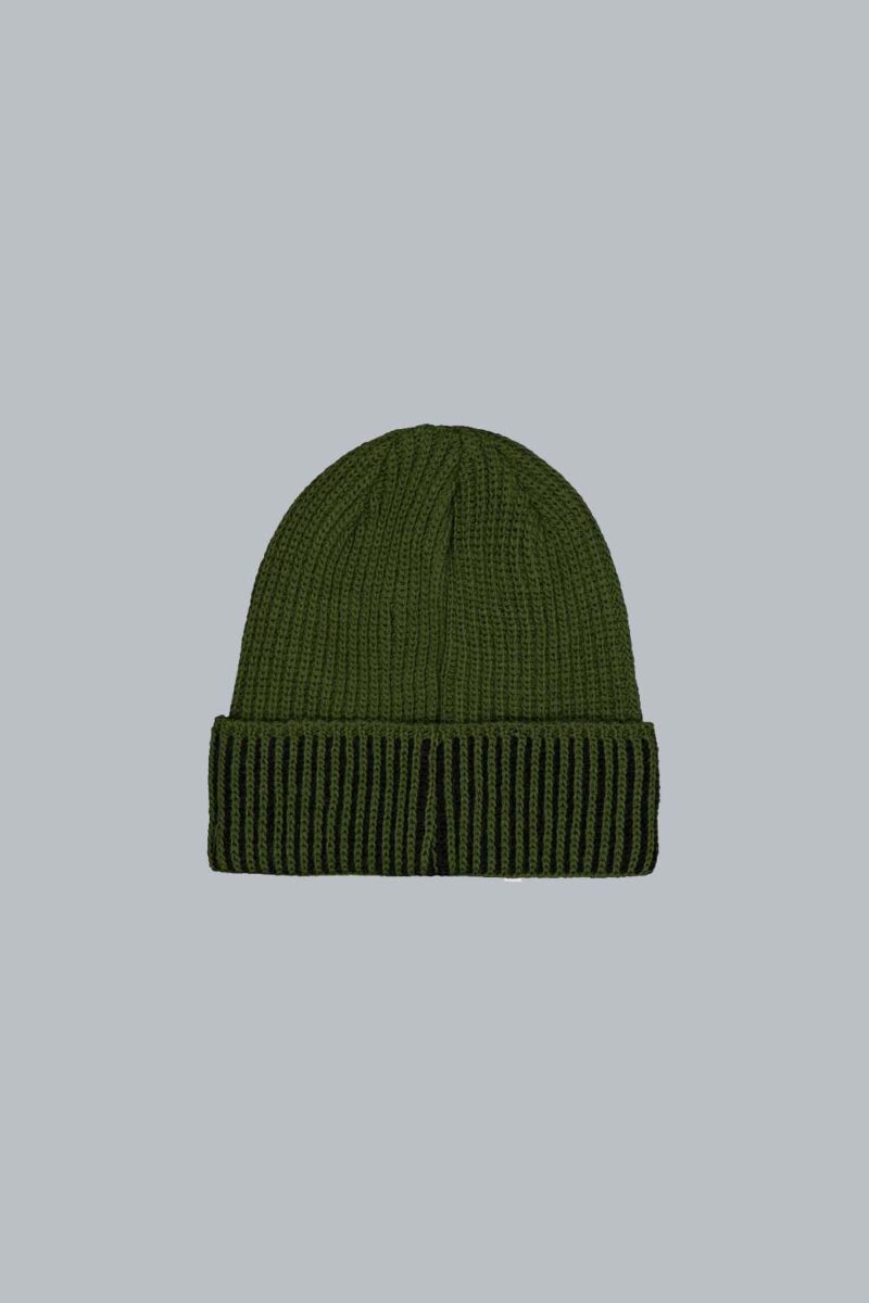 Cappello in maglia a coste in colore verde da uomo con risvolto realizzato in trama vanisè a due colori.