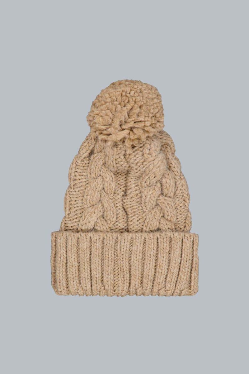 Cappello in maglia con pompon da donna in colore tortora, impreziosito da una ricca lavorazione a costa piatta e a treccia, che dona corposità e tridimensionalità alla texture.