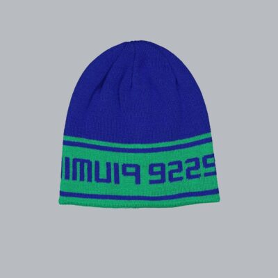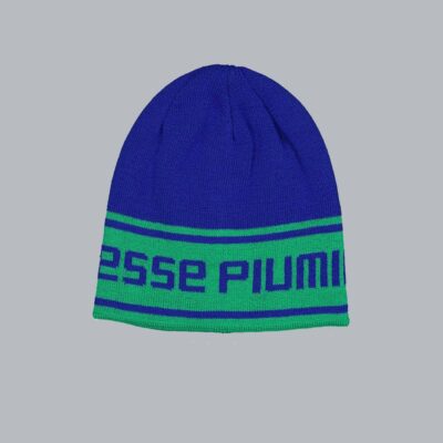 Cappello unisex in maglia in colore blu cobalto con scritta Jacquard Ciesse Piumini a contrasto.