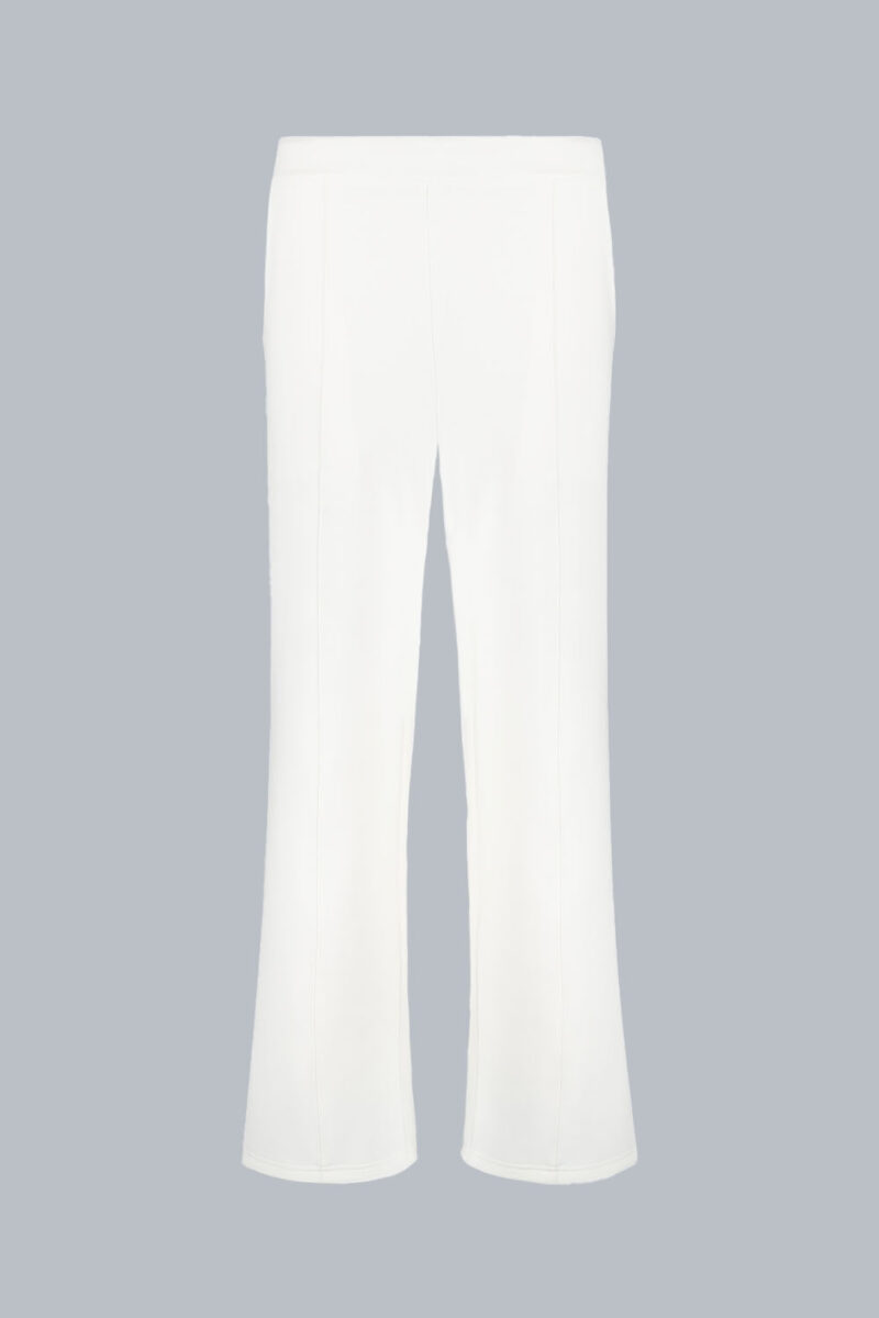Pantalone ampio con piega da donna in colore bianco, morbido ma strutturato, e realizzato in tessuto tecnico dall’aspetto semi-lucido.