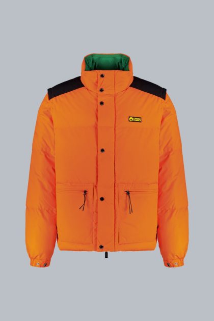 Il capo è inoltre valorizzato da un labeling dedicato interamente ispirato alla versione anni ’80 della collezione Ciesse Piumini e presenta un patch triangolare realizzato in pelle di mela.