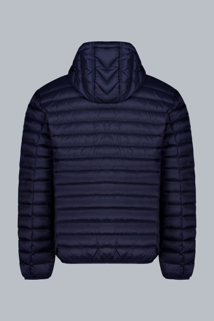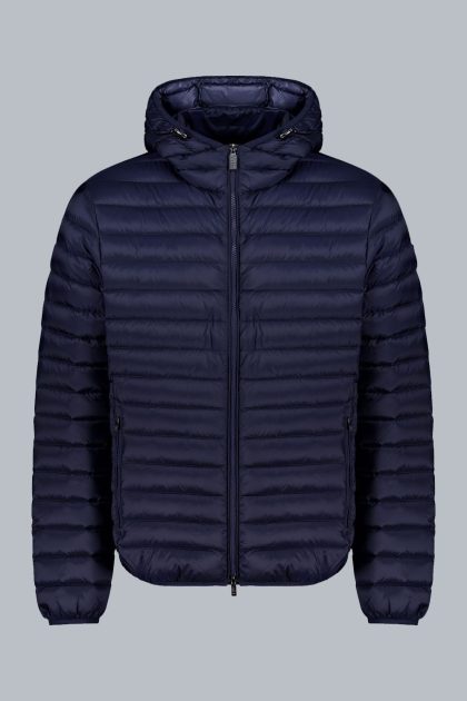 Piumino blu leggero opaco con cappuccio in vera piuma