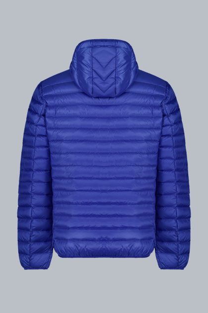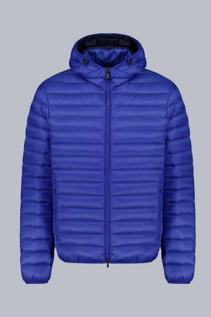 FRANKLIN 2.0 – Piumino 100 grammi blu cobalto con cappuccio in vera piuma 800 fill power