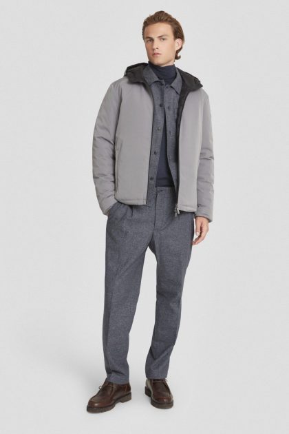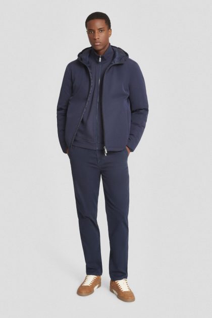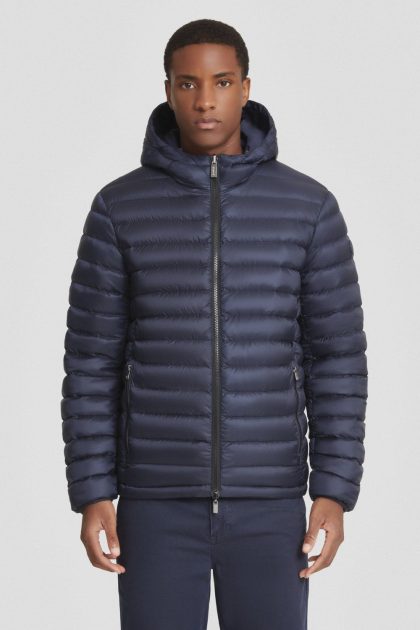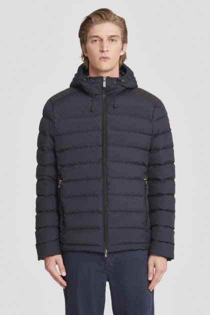 Piumino trapuntato blu con cappuccio e maniche staccabili